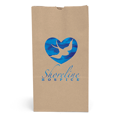 These durable paper bags feature a serrated top that can be folded for closure, as well as a side gusset. SOS Bags are perfect for holding retail, pharmacy, and newsstand purchases. Available in white or recycled brown kraft paper colors and three sizes. Brown kraft paper is made with 100% recycled material, 80% of which is post-consumer contentImprint Details
