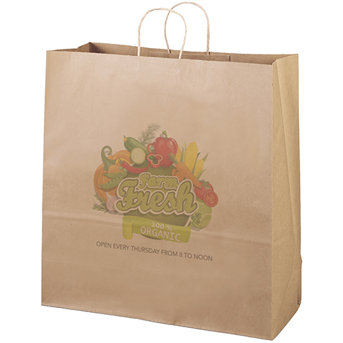 This eco-friendly brown kraft-paper shopper features matching twisted paper handles and serrated cut top. Made from 100% recycled paper with a minimum of 60% post-consumer content.Imprint Details