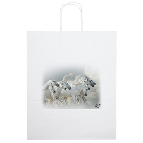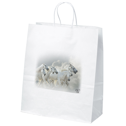 This popular white kraft-paper shopper is functional, affordable, and includes matching twisted paper handles and serrated cut top.Imprint Details