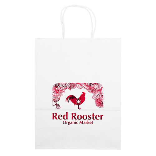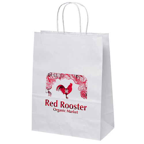 This popular white kraft-paper shopper is functional, affordable, and includes matching twisted paper handles and serrated cut top.Imprint Details