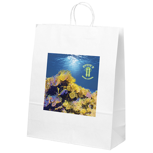 This popular white kraft-paper shopper is functional, affordable, and includes matching twisted paper handles and serrated cut top.Imprint Details